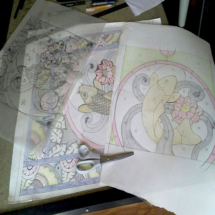 En général le vitrailliste prévoit un filet de scellement, donc un filet blanc qui entoure tout le vitrail, qui est prévu pour disparaitre sous le mastic.